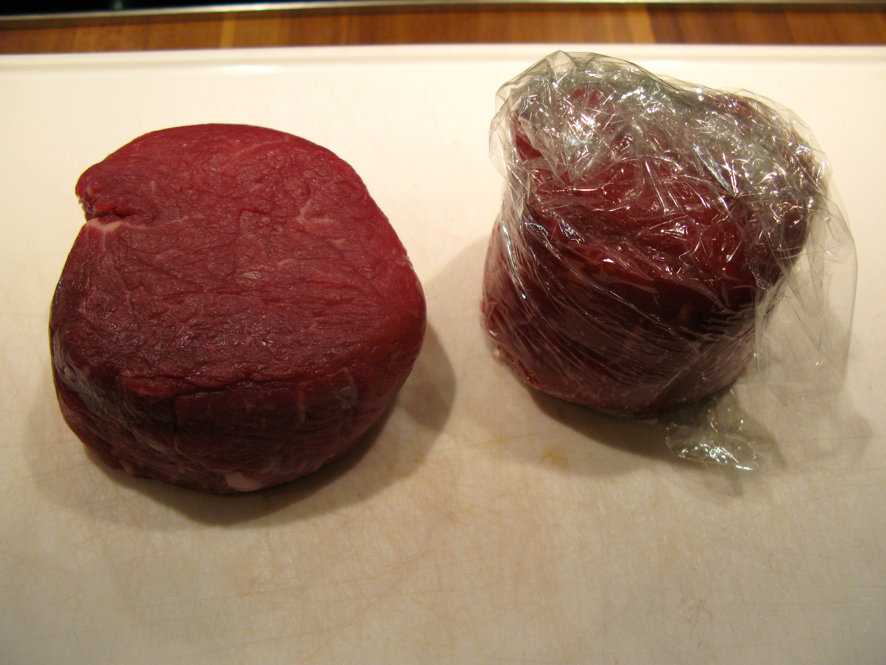 Das Rinderfilet wurde in Clingfilm/Frischhaltefolie stramm eingewickelt und für einen Tag im Kühlschrank geparkt – es soll ‚Form‘ bewahren.
