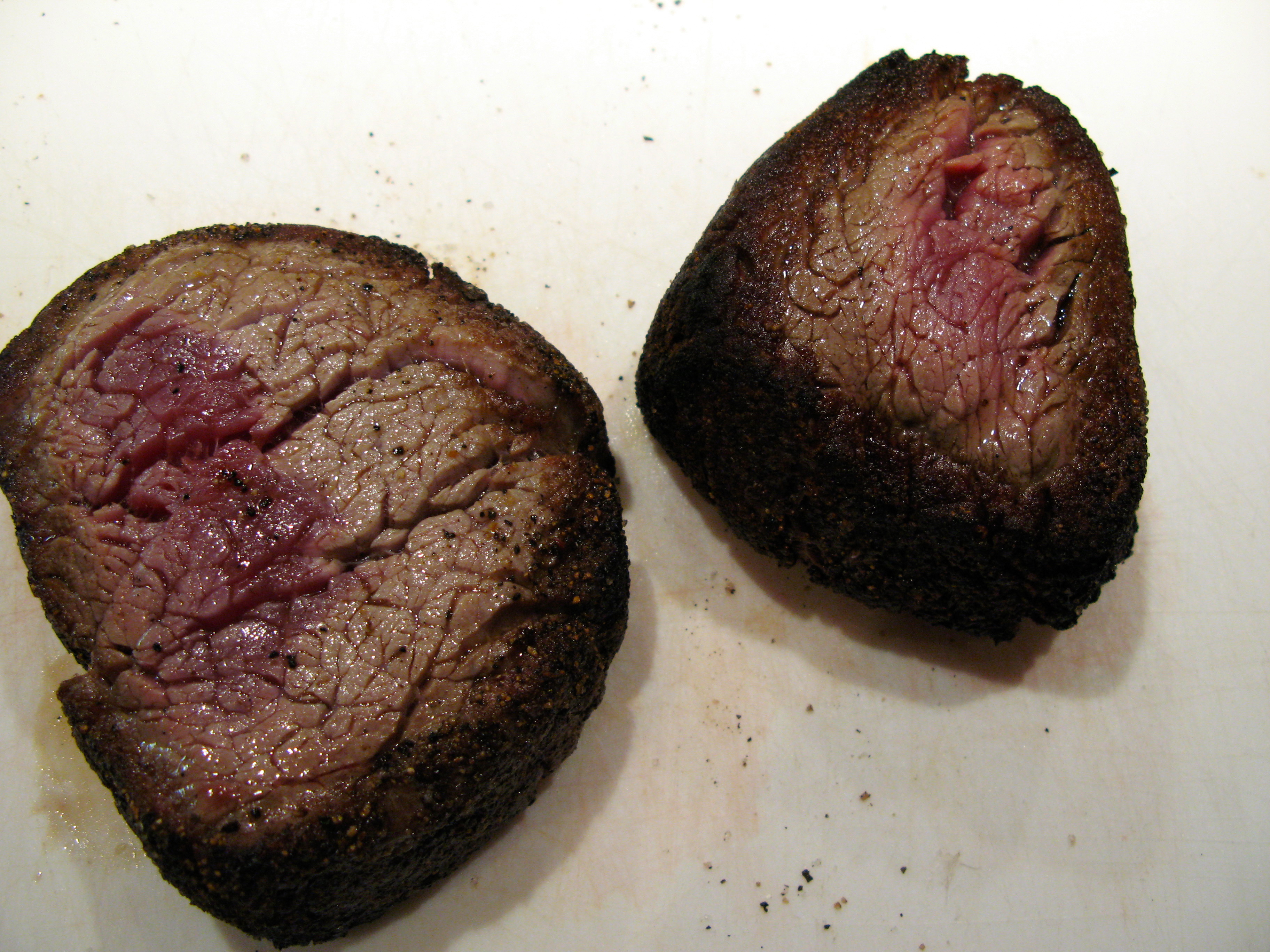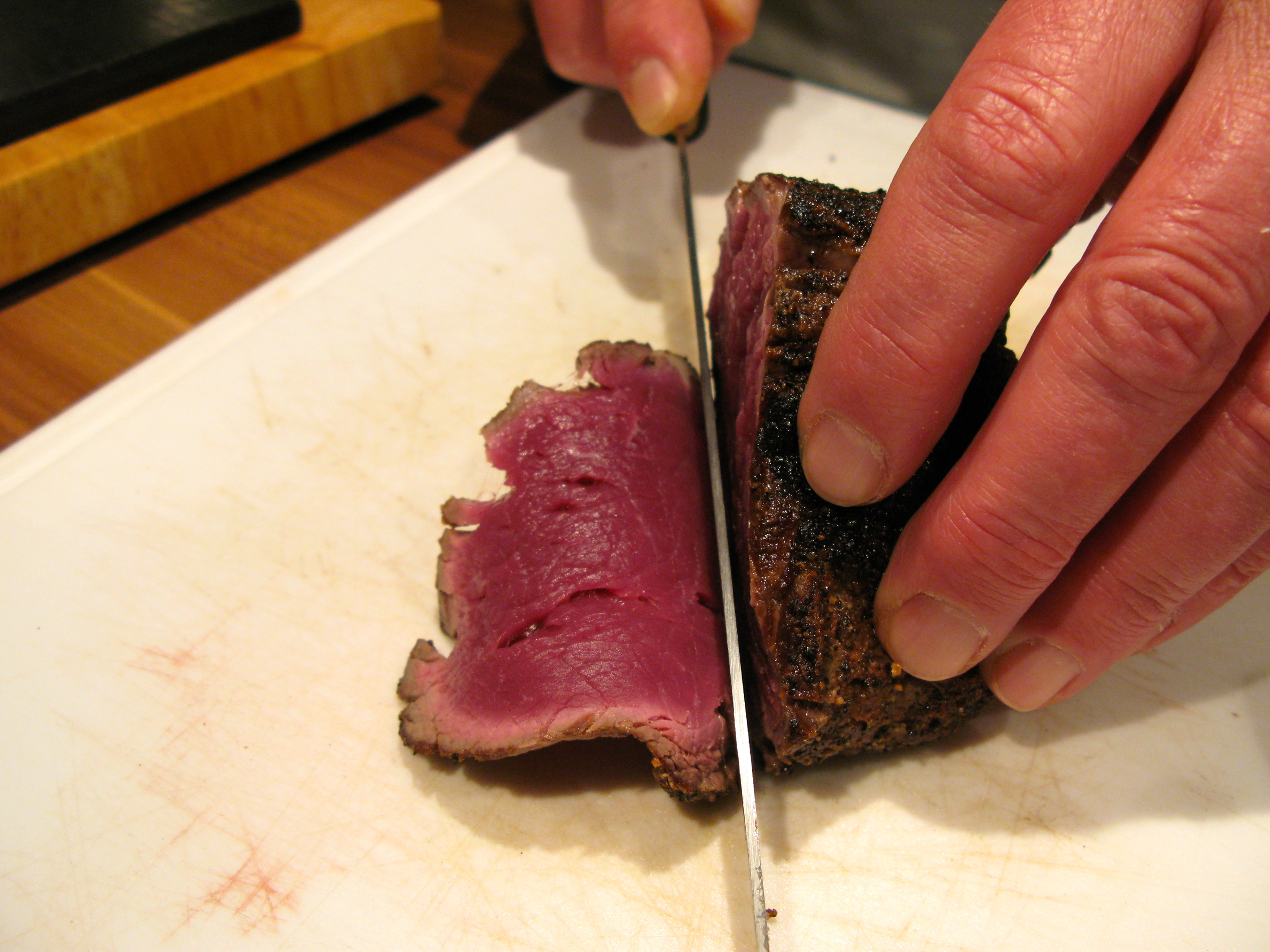 Fleisch in ca, 0,5 cm dicke Scheiben schneiden und mit einem breiten Messer oder Hackmesser dünn ausstreichen. Die Bratkruste hält die Scheiben zusammen.