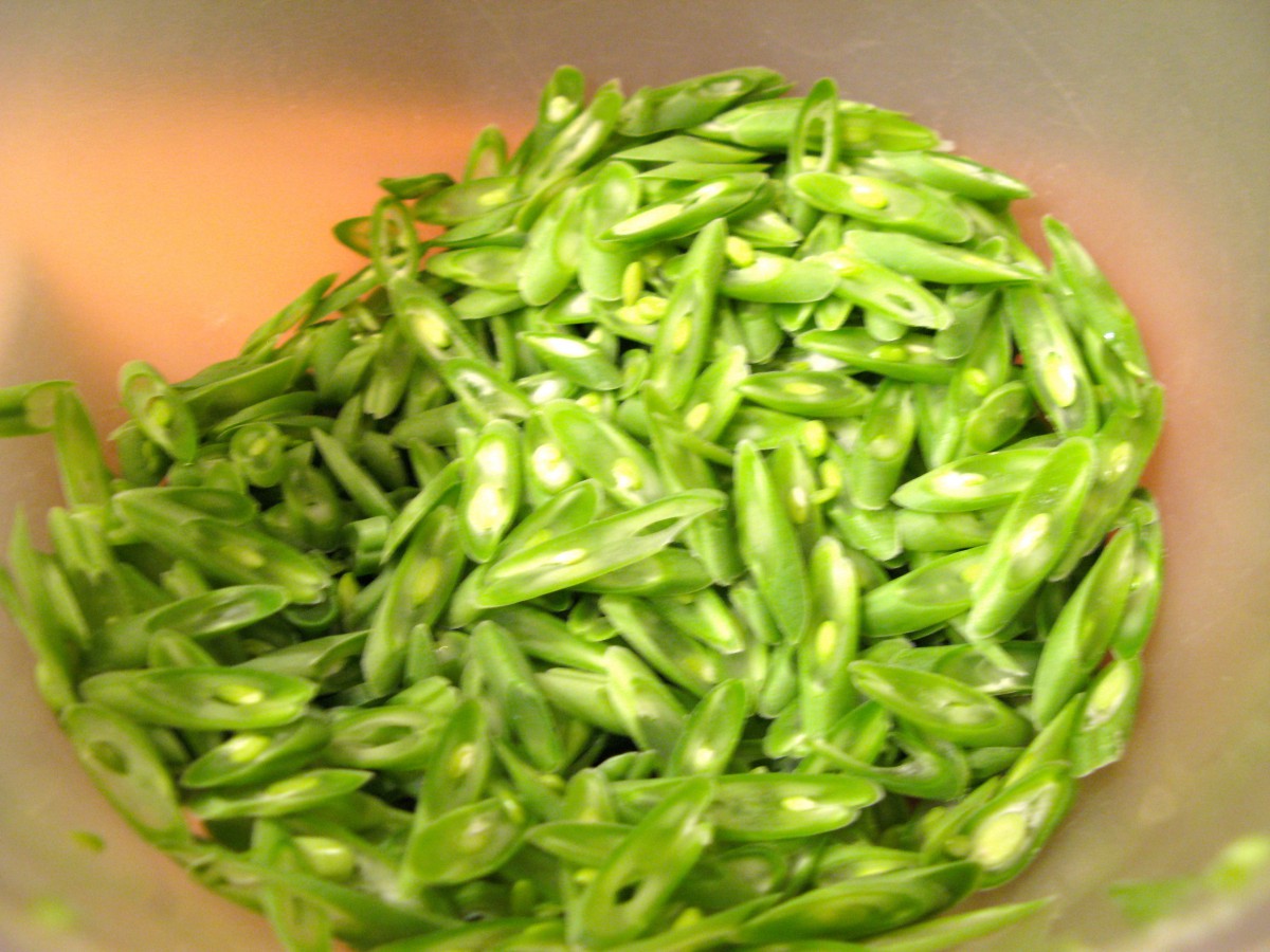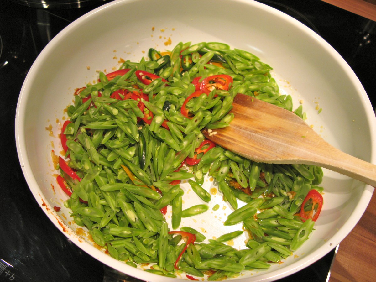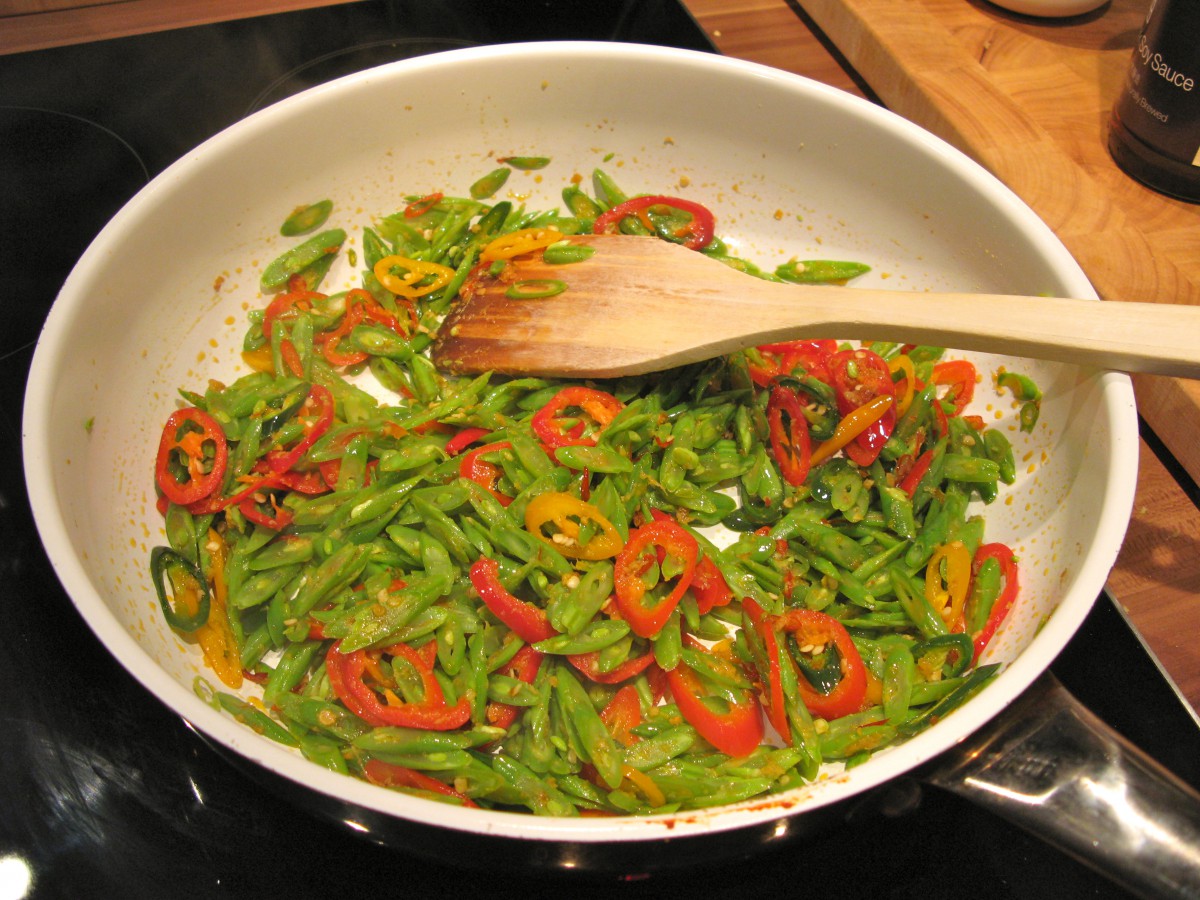 Bohnen und die großen Chilies dazu geben und bei mittlerer Hitze für etwa 5 Minuten garen.