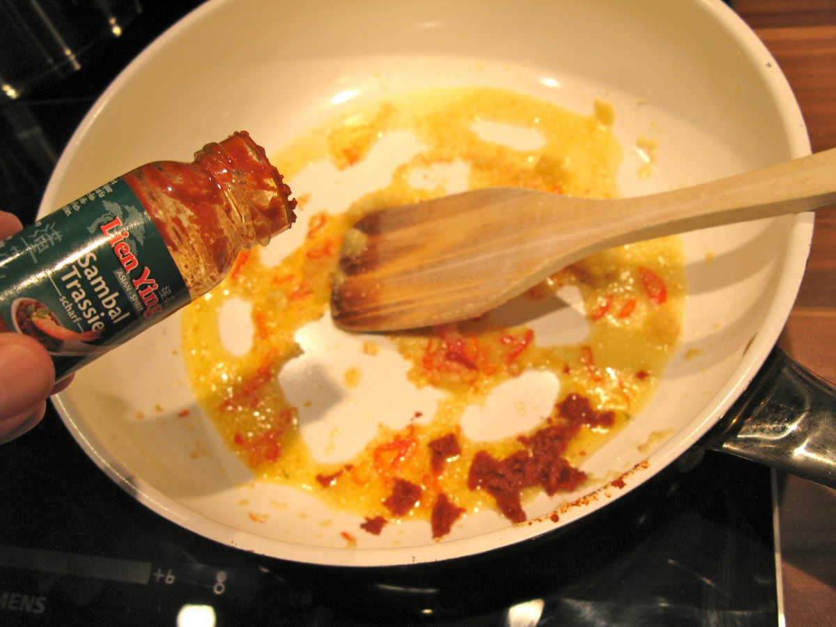 Scharfe Chilies, Ingwer und Knoblauch in 2-3 EL Erdnussöl anschwitzen und 1-2 TL Sambal Trasi (das ist eine Mischung aus Chilies und Garnelenpaste – gibt es mittlerweile schon in vielen Supermärkten, ist aber besser aus dem Asia-Markt) dazu geben.