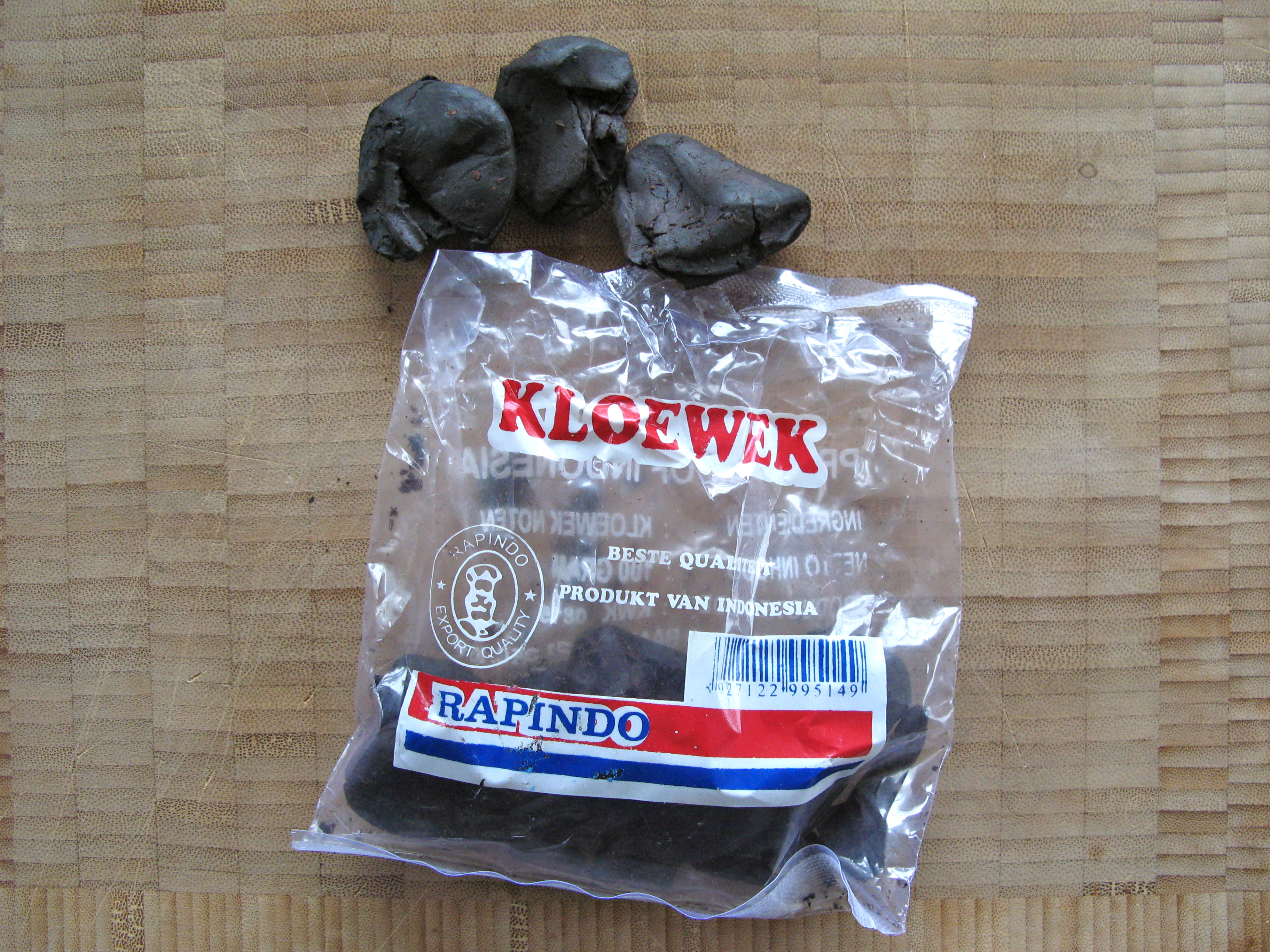 Rawon gehört zu Surabaya wie die Weißwurst zu München. Die Besonderheit ist auf den ersten Blick die unappetitliche schwarz-grüne Farbe, die nicht nur bei hartgesottenen Experimentalgourmets zumindest ein stirnrunzelndes Naserümpfen hervorrufen kann…doch diese Farbe kommt von einer unverzichtbaren Zutat:  Keluwak (auch Kluwak, Keluak oder Keluwek geschrieben), die Samen aus der Frucht des Pangi-Baums (Pangium edule). Nun wird es spannend: In frischem Zustand sind diese Samen hochgiftig, da sie Blausäure enthalten! Erst durch Fermentation werden sie genießbar und nehmen die typische schwarze Farbe an. Erinnert einen so ein bisschen an den japanischen Kugelfisch, nicht wahr? Nun, ich kann Euch beruhigen. Ich habe während meiner Zeit in Indonesien oft Rawon gegessen und ich lebe noch. Auf der Verpackung steht die holländische Bezeichnung ‚Kloewek‘, denn, das gebe ich unumwunden zu, in Deutschland wird man wohl kaum fündig werden. In Holland, wo heute noch viele Indonesier leben, gibt es Keluwak, als getrocknete Frucht oder auch als gepresste Trockenmasse zu kaufen. Beides muss vor Verwendung in Wasser eingeweicht werden, die getrockneten Früchte über Nacht. Wie kommt man also an Keluwak, ohne selbst nach Holland zu fahren? Ich habe das Glück, eine Foodbloggerin mit ähnlich ausgefallenen kulinarischen Interessen zu kennen und die hatte ein Päckchen in ihrem Gewürzschrank und hat es mir ohne Zögern geschickt! Danke, Tina von foodina.eu!