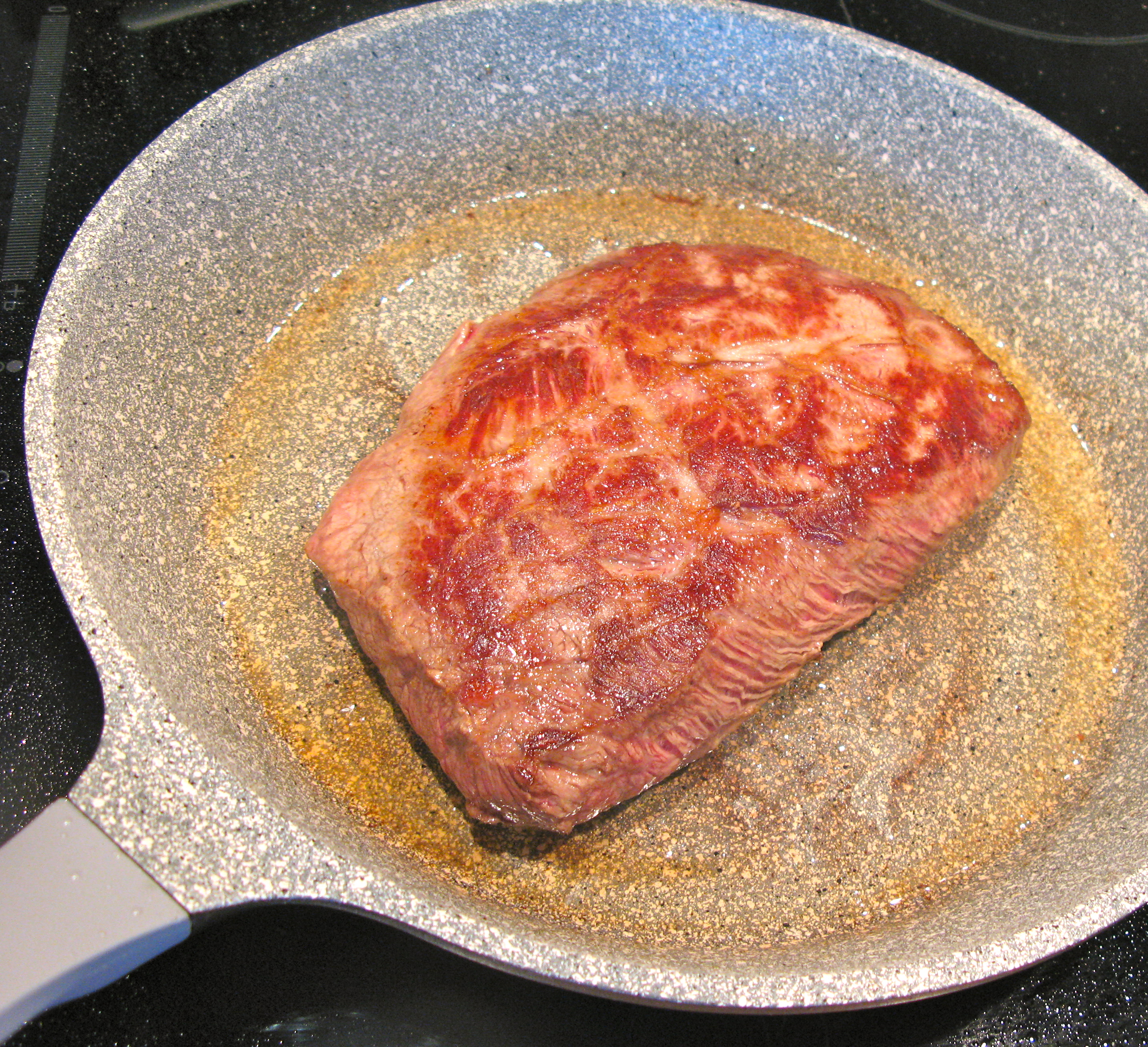 Fleisch in einer beschichteten Pfanne braten geht nicht? Aber Hallo! Da bin ich ganz anderer Meinung. Einen EL neutrales, hoch erhitzbares Öl oder Butterschmalz in der Pfanne erhitzen und rein mit dem Teil!