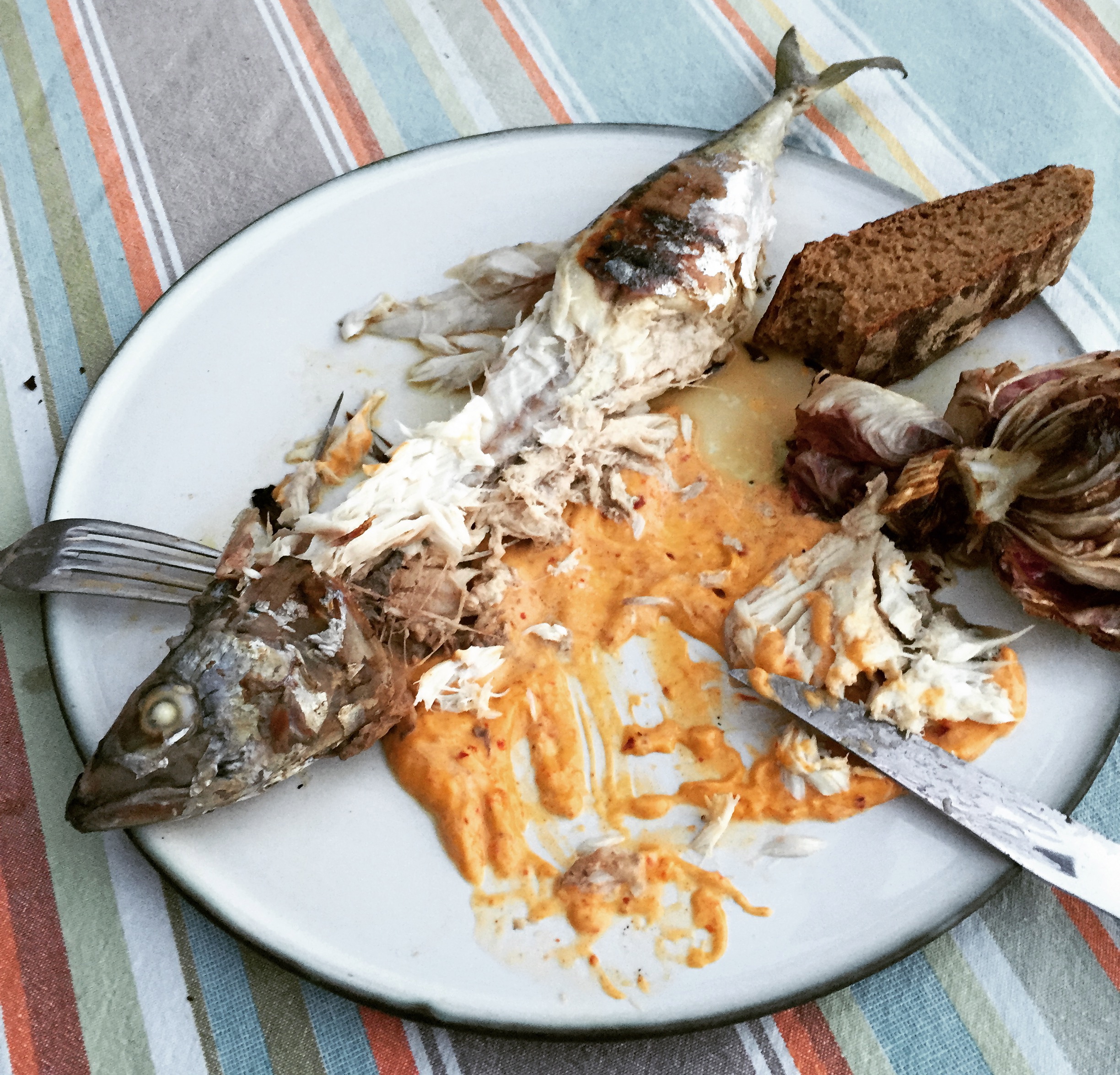 1. Mit frisch geriebenen Meerrettich, ein paar gesalzene, hauchdünn geschnittene Gurkenscheiben und gerösteten Bauernbrot. Meine Lieblingszubereitung für gegrillte Makrele.